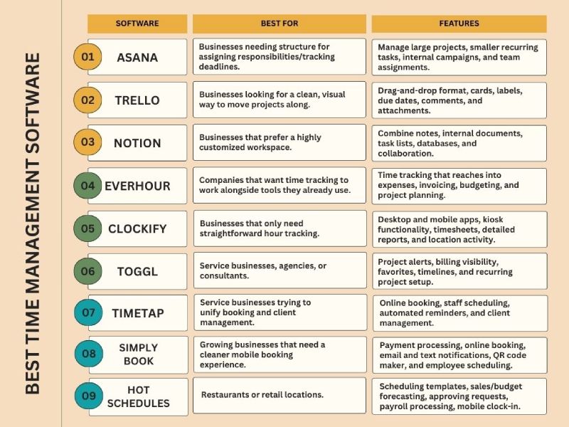 - If you run a growing service business, the best time management software for you might be Asana and TimeTap